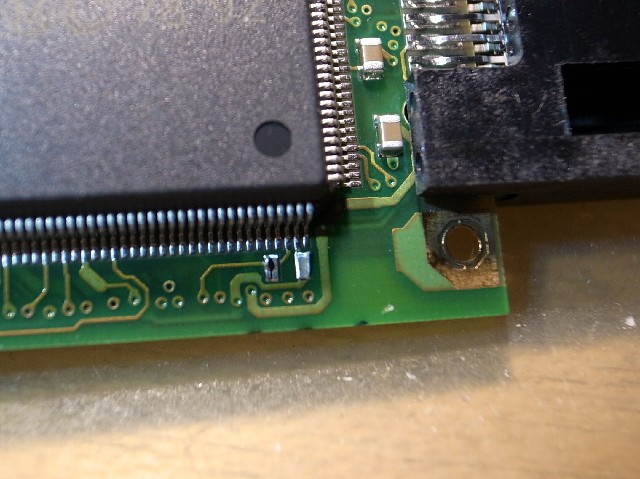 すると、一部に部品の欠損のような跡が認められました。 最初から部品を付けていないことは、電子基盤には良くあります。 他の基盤と比較したところ、抵抗器(registor、レジスター)が欠損していることがわかりました。 WIKIPEDIA:resistor |