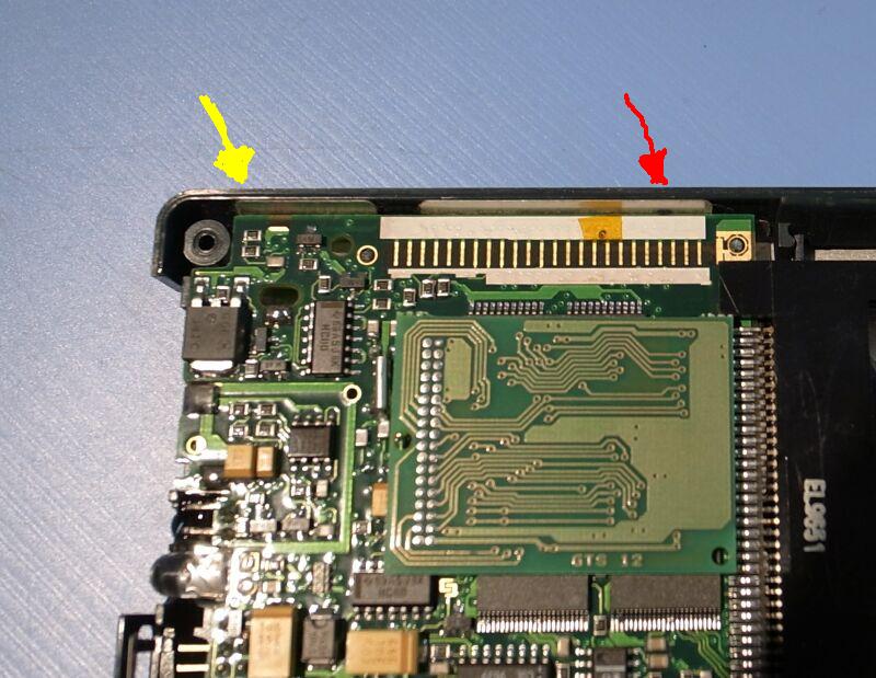 | さて、部品脱落の原因を考えます。 脱落したレジスター(抵抗器)の位置は、赤矢印の部分です。(左写真、中央写真) 黄色の矢印は以前の故障例であり、同様に落下で外れた部品です。 どちらの脱落例も同じ側(がわ)ですが、今回の脱落は、頂点部からは離れており、しかも基盤上の配置も簡単には触れない位置にあります。(中央写真)クリックで拡大させると良くわかります。 良く見ると、キーボードのコネクタを部分的に押さえるために、筐体内部にダムのような突起が設けられています。(右写真、赤丸部) 落下の際に、このダムが基盤上の抵抗器に当たって、剪断するように外したものと考えます。 2011.01.22 PDF(タイムスタンプ) >タイムマーク |