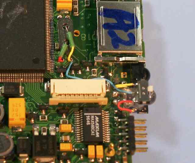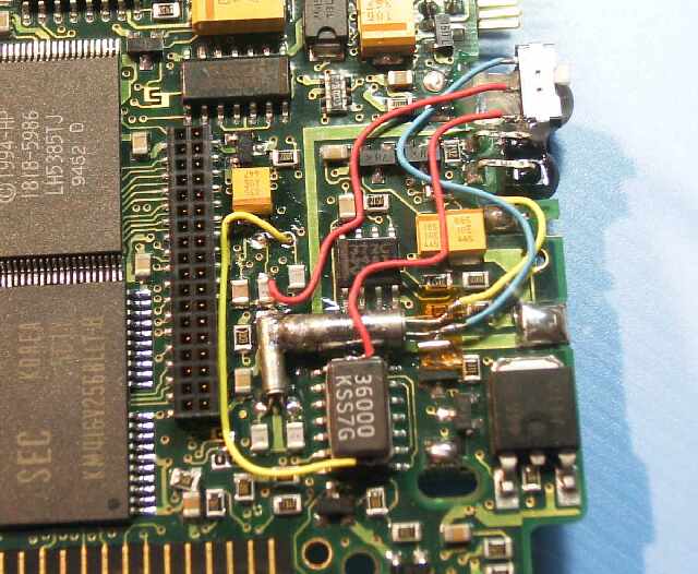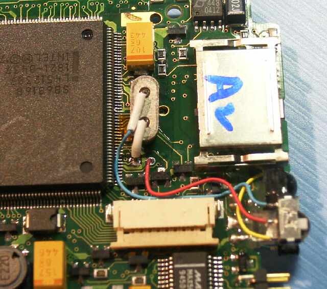 水晶からのリード線は、直下のスルーホール(水晶取り付け端子)に半田されず、裏面へ通過しています。