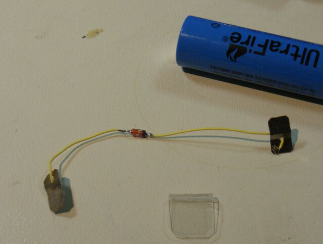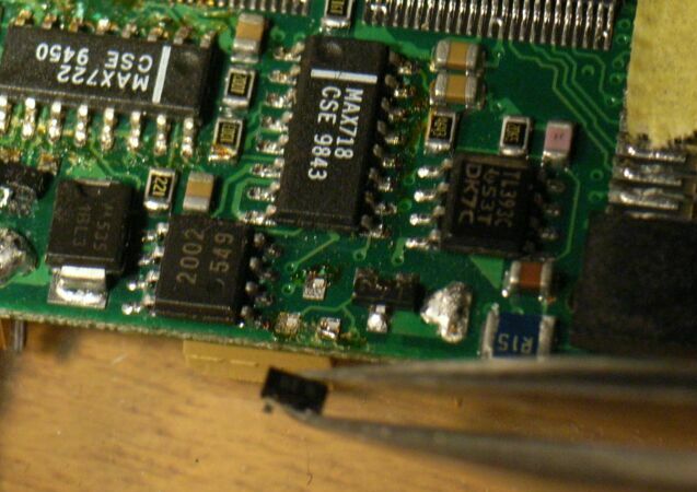 過剰電圧で壊れた部品その後、壊れた(異常に高い電池電流となった。)部品を調べたところ、電源制御IC(MAX718)付近のダイオードが短絡(破壊)していました。 (追加2010.02.22) |