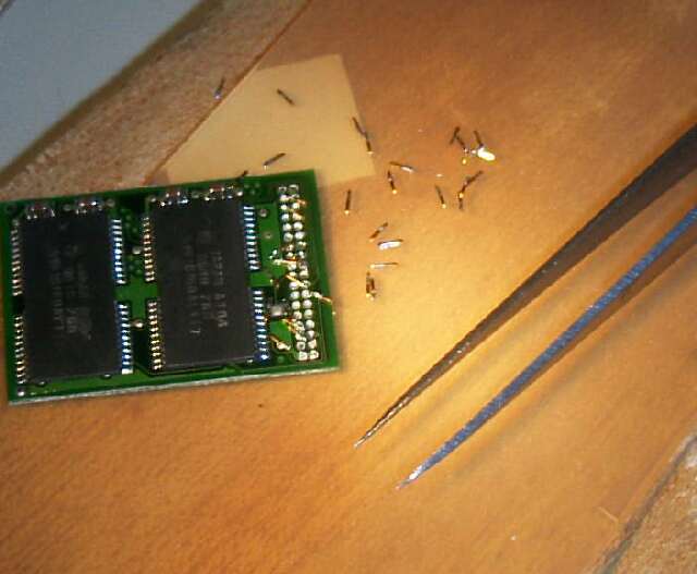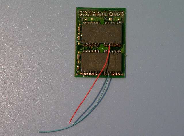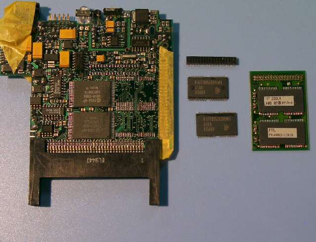 | メモリは5MBあれば通常は十分だと思いますが、1Mでも良いので更に増やしてほしいというご依頼がありました。 そこで、2MBのチップを使用して8MB化してみました。 手法はいろいろ考えられますが、ここでは主基板のメモリを外し、4MBの拡張基板を8MBにする方法をとりました。 2MBのチップは、サスペンド(休止)時の保持電流が少なくて良いので、拡張によるデメリット(電池の消耗が早くなる弊害)は比較的少ないです。(実測0.4mA / 3V) |