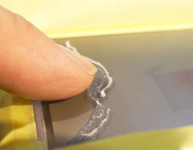 反射板(反射紙)は液晶裏(偏光板の上)に密着されていましたが、これを剥がした後には粘着材(剤)層が残ります。