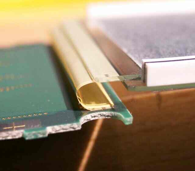 フレキを痛めない「こつ」は、液晶ガラス部(右側)の方を少し高くさせ、フレキ部を横から見てU字型に曲がるように固定することです。