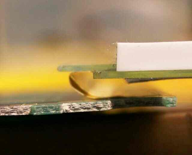 おそらく溶けた粘着材の一部が電極に付着したためではないかと思います。