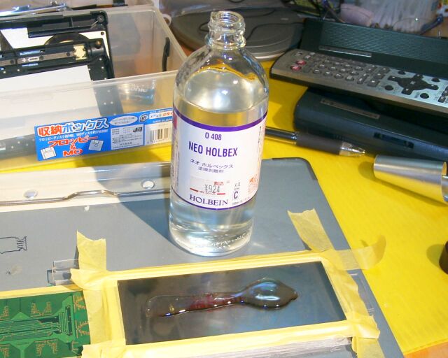 それでいろいろ溶剤を試し、写真のような剥離剤が良好であることを見出しました。 (ホルベイン社 ネオ ホルベックス 塗膜剥離剤)