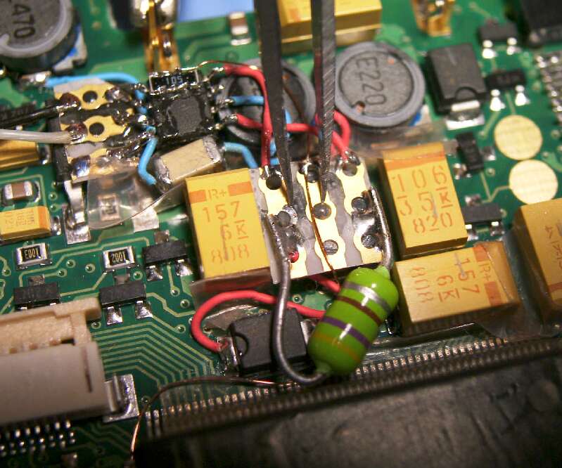 写真では、動作確認のために、ピンセットで端子をジャンプさせて(導通させて)、バックライトONの信号を(+)電源から仮に取っているところです。