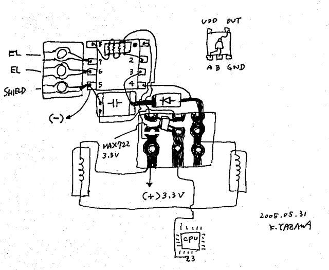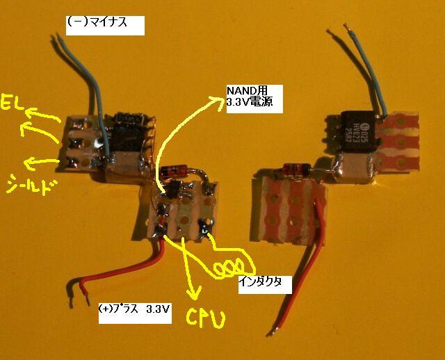 写真のように、マイナス(負極)(青線)は、左上のインダクタの一端子から、