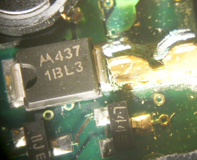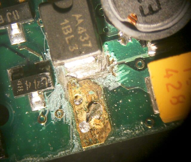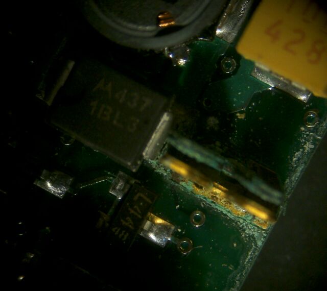 によるものでしたが、この例では電池漏れと思われる液状物質により、基板上の銅配線が抵抗を持って短絡し、無用な電流を消費していたものです。