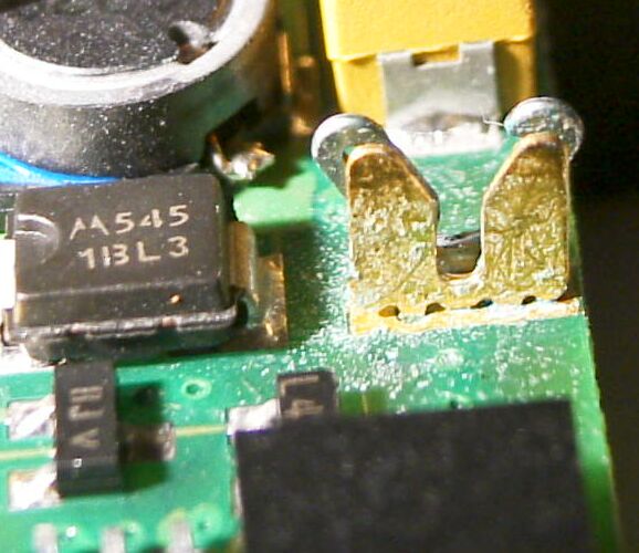 腐食部分の拡大です。2枚の写真は、同じ部分を別の角度から見たものです。 電極(写真内右のV字型クリップ)と隣の左の四角い部品との間に、腐食物質がたまっていることがわかります。