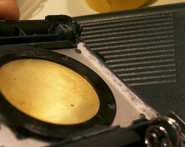 割れをまたぎ、挿入口全体を補強するように、置きます。
