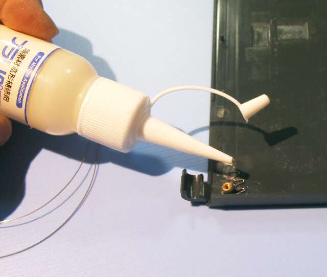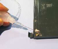 少量を滴下(てきか)するために、ドライバの先に付けて、これを割れ目にしみこませるように垂らします。