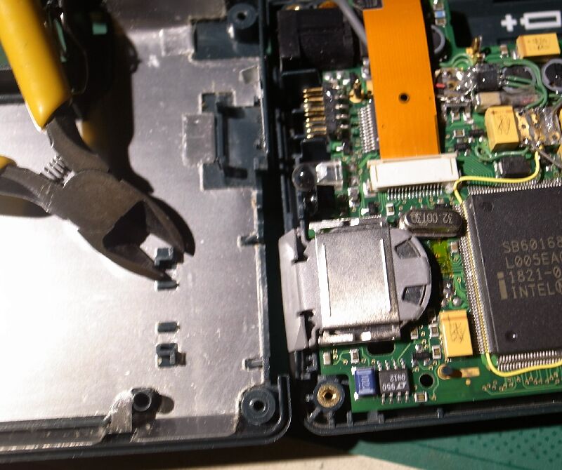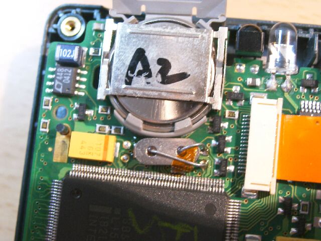 この写真は、汎用水晶が横向きに取り付けられたもの(表面に透明テープが巻かれています)ですが、底蓋と接触して動くためでしょう、足の半田が不良になって200LXの電源が入らなくなっていました。 |