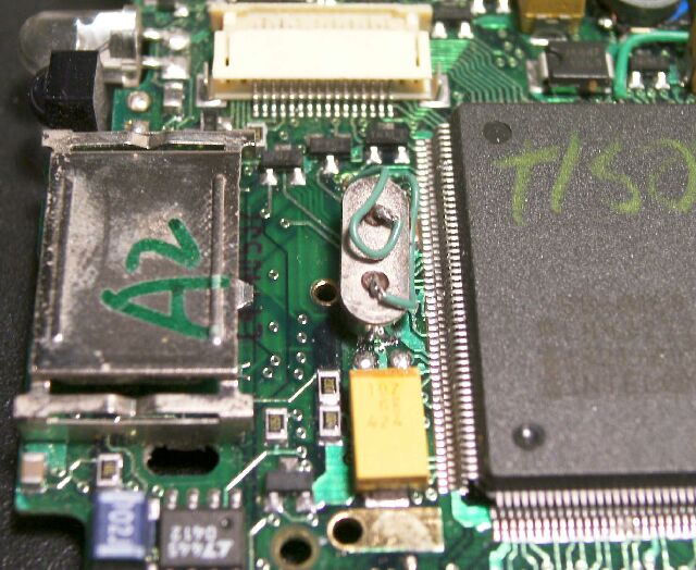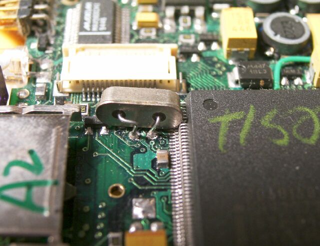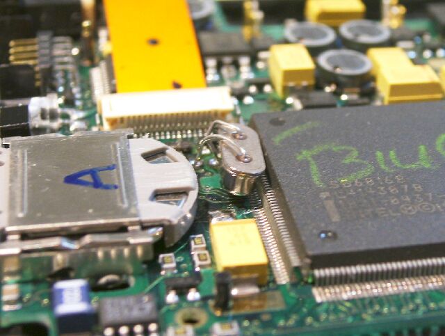 | hp200LX故障例: 水晶の取付不良(とりつけふりょう) ( Trouble occured by wrong crystal installation. ) |