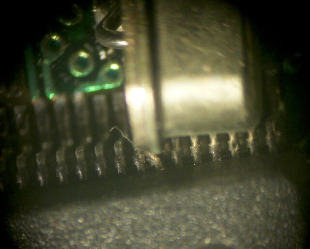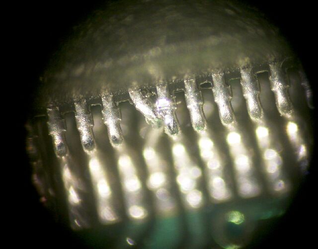 | これは、交換した水晶の取り付けが悪く、動作に不良を生じた例です。 、当初は正常に動作し、交換成功と思っていたものの、不具合を生じたとして、送付されてきたものです。 2例ありますが、いずれも水晶のケース(外側)が、CPUの足に接触して回路を短絡させていました。 |
