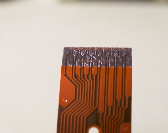 また、このコネクタに入るフレキシブル印刷線(フレキ)の接触部(下の写真)に皮膜がある場合も接触不良を起こします。