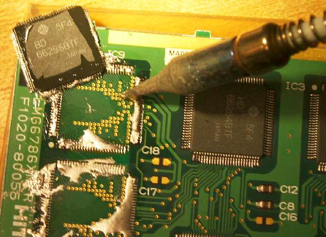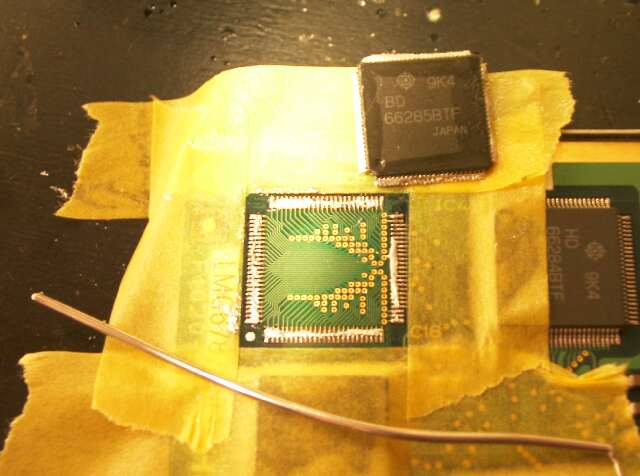 写真でもわかるように、四辺に低温半田を盛り、足を順に暖めて(溶かして)ゆくと、するっと横へ動きます。
