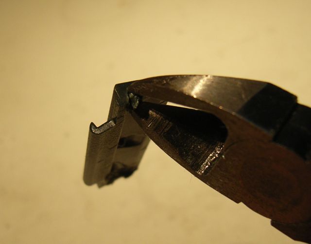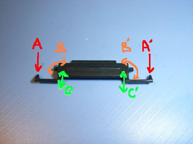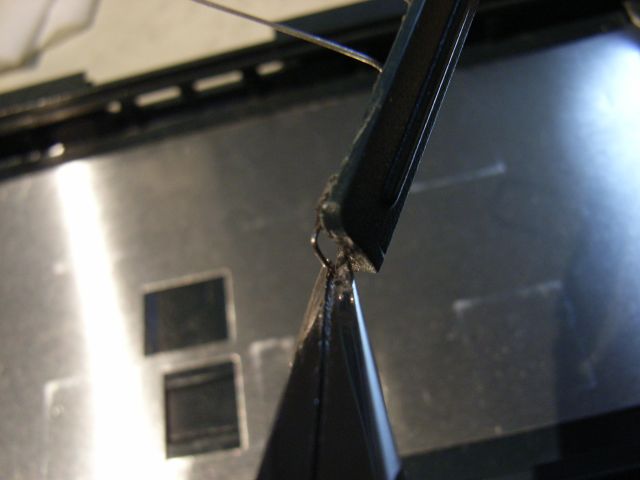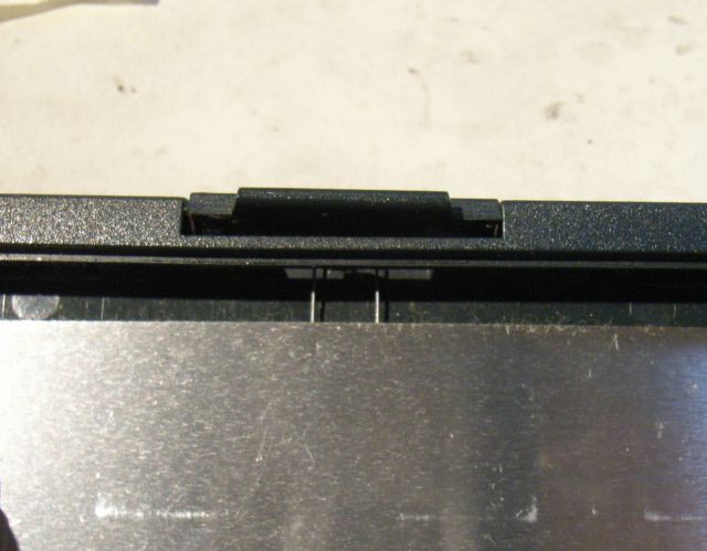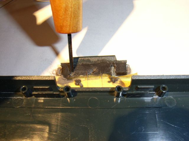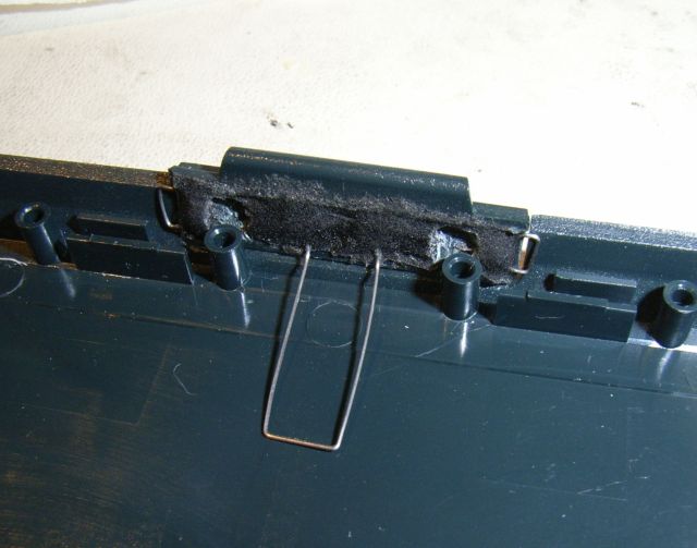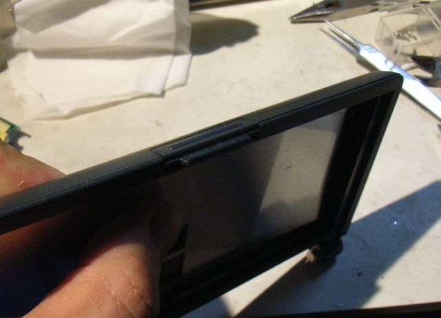 | 液晶のラッチ部は、電池蓋の爪と並び、最初に壊れる部分と言えます。 前回に、ラッチ部の最終的修理方法を示しましたが、それでも長期使用には無理があるようです。 修理により、ラッチの保持状態が良くなることが逆に仇となって、脚部が割れ、ラッチごと抜け出てしまう例がありました。 さらに改良を試みます。(ただしこの方法は、他の修理方法がとれない場合の最終手段です。) 液晶ラッチが、きれいに嵌(まは)り合うと、急いでいるときなど、ラッチが外れていない状態で液晶が開かれる(開いてしまう)ことがあります。 この場合、液晶を開こうとする力が、てこのようにラッチ部に集中し、補強により強くなった脚部でさえ耐えられない状態になるようです。 結局のところ、完璧な保持力(ラッチ)を求めることは無用な破損を招くことになりそうです。 ほどほどが良いようです。 この修理例は、ラッチ部が抜け出さないことを主に考えた補修です。 |