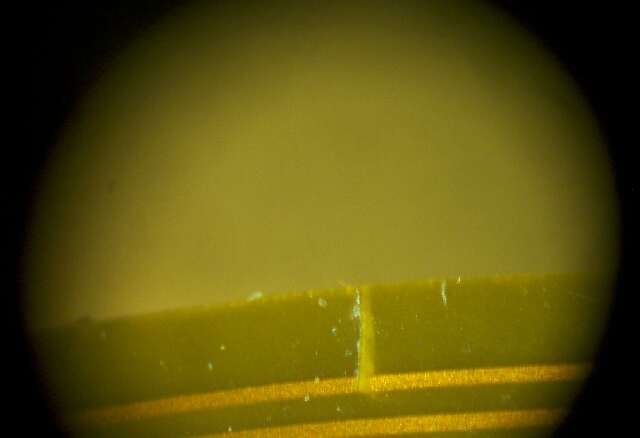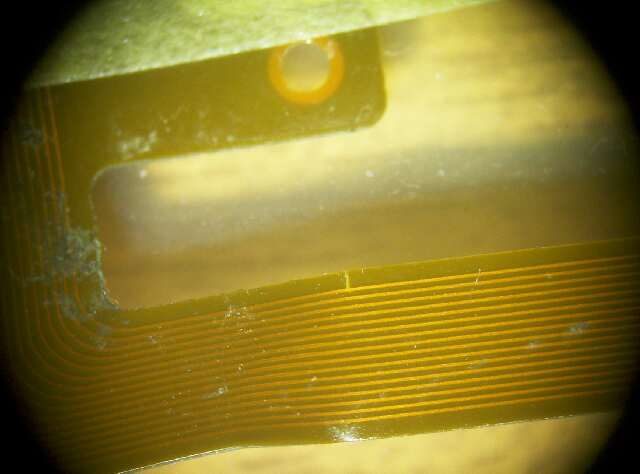 良く拡大すると、フレキの上部から割れが入り、銅のパターン(印刷導体)にまで達しています。