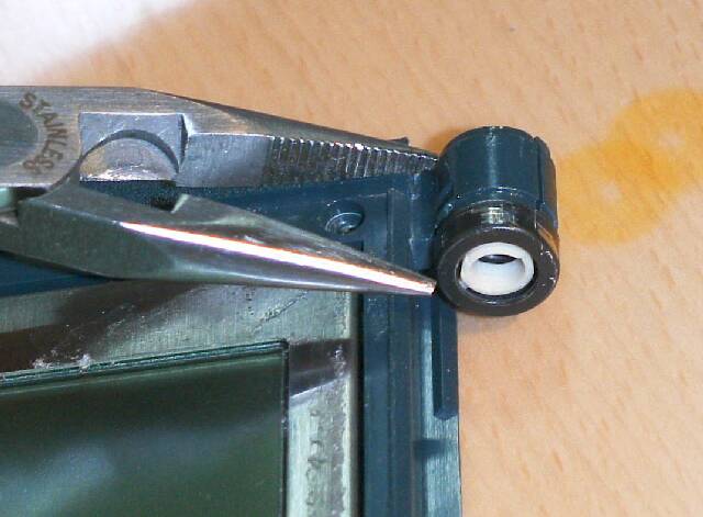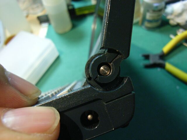(3)組立て e)支柱保持部材、d)スプリングを挿入します。 ここで、スプリングがヒンジ基部からはみ出ない程度になります。 次に、c)摩擦部材を方向と角度(突起部が割れ目にはまり込む)に気をつけて挿入します。 (写真左) ヒンジの外側を押さえて、摩擦部材が飛び出さないようにしなから、ヒンジ環をはめ込みます。(写真中) プライヤで挟むように、ゆっくり挿入してゆきます。(実際にはプライヤを使わず、指で押さえながら入ります) 最後に a)支柱を挿入して組立て完成です。 |