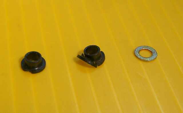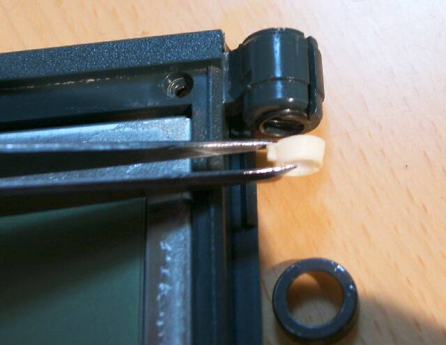 現在は、ワッシャーをあえて使っていません。 なぜなら、元々のワッシャー(支柱保持部材(シャフトホルダー))は、割れて粉々になっているものが多いものの、機能にはなんら影響していないからです。 かえって支柱を押さえると、写真のように軸中心がずれている場合(分離したヒンジを直した際等)には、余計なストレスを与えることになります。 つまり、ワッシャー等で固定しないほうが、逃げ(遊び)がある分、偏った応力を防止し、壊れにくくなると考えます。 (2009.10.10追加 ) |