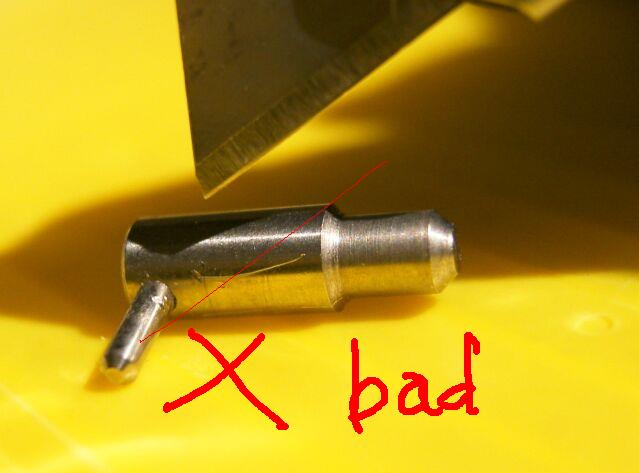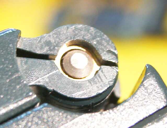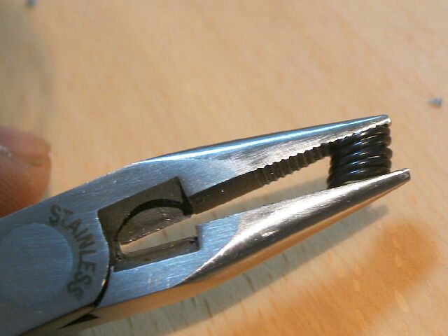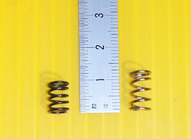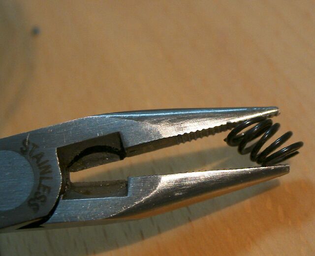 (2)スプリング調整 (スプリングは総じて反発が強すぎる傾向にあるため、スプリング力を弱めるように調整します。) プライヤで斜めに挟んで縮めると、反発の限界を超えるため適度に縮んでくれます。 調整前の 1.2cmから ⇒1cm程度まで縮む。 |