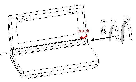 ・ヒンジ部には液晶を操作するたびに40の力がかかり、耐えられなくなったプラスティック製ヒンジ(右のみ)に割れが入り、いずれ破断します。(これが首折れと言われる不具合です)