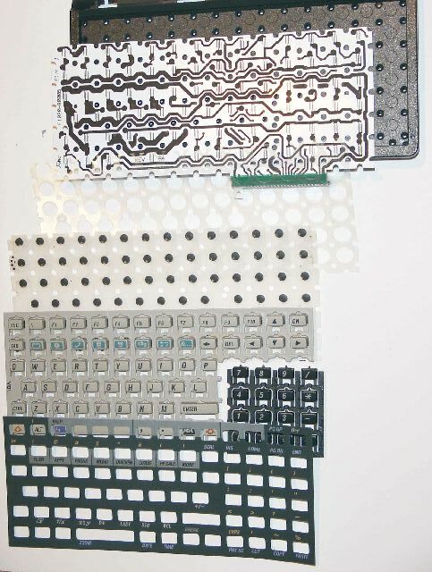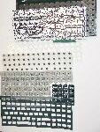 | キーボードの構成部品 上から、 台座 電極パターン スペースフィルム 上部電極フィルム キートップ 表面材 |
