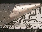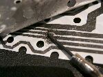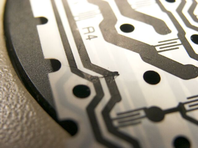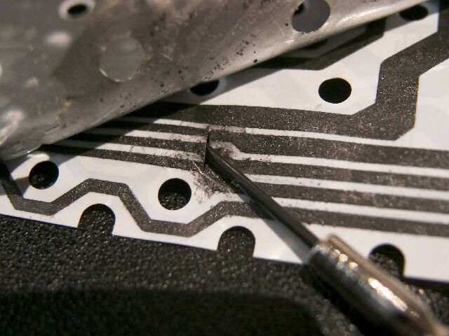 | おそらくキーの感触を調整しようとして、フィルムに切り込みを入れたのでしょうが、この際に、キーボードを分解せずに行ったため、電極パターンまで傷つけてしまったものと思われます。 |