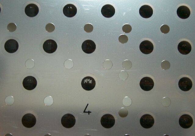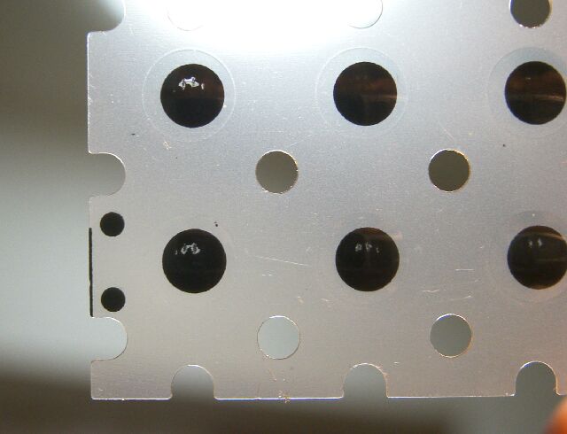 この写真も電極の減りを示しており、黒丸の内部の白い部分は減りにより、後方から光が漏れている(電極材が磨耗している)状態です。