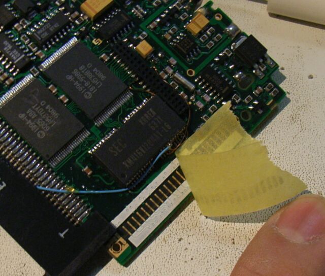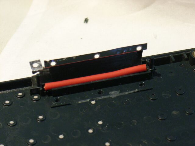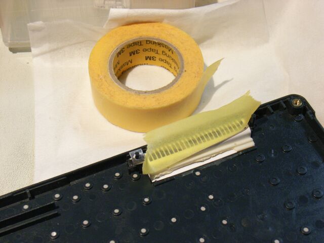 | hp200LX 補修例:キーボードコネクタを圧するクッション材(柔軟電線を使う)。 hp200LX Repair: Using electric wire to the cushioning material for electrical connector of keyboard.) |