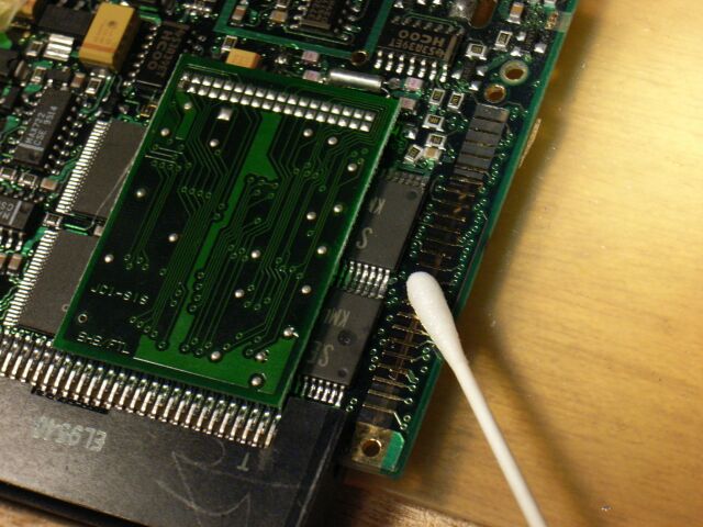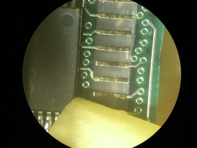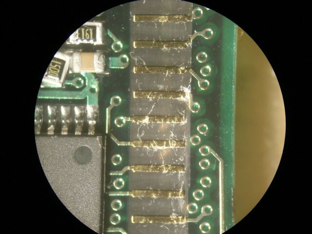 今回は、新たな素材(材料)と、組み立て時のコネクタ清掃法を示します。 200LXを長年使っていると、キーの認識不良を1度は経験します。 これは、基板をキーボードとを接続する部分(コネクタ)の圧接にスポンジを使っているためです。 スポンジは、経年(経時)により硬化し、コネクタの歪みを吸収することができなくなる結果、電気的な接触不良を招くためです。 これは、液晶の不具合の過程と同様です。 この接触不良解消策として、オーリング、バンコードを使用しています。 しかし、適当な直径のオーリングやバンコードは入手が難しいので、より入手しやすい素材として、電線を使ってみました。 ![]() 今回使用した電線は、テスターのリード用として売られていたものであり、直径が2.4mm、素材は柔軟ゴム状です。 他にも様々な電線や、ビニールチューブなどが使えるかと思います。 ![]() ちなみに、2.5mm程度の直径の場合、ネジ止めには不適です。 なぜなら、ネジに押さえられた基板の中央部が山形に変形してしまうからです。 ネジ留めの場合には、2mmのバンコードを使うようにしています。 基板とコネクタの取り付けは、単に基板を置くだけになります。 その後、底蓋を取り付ける際に圧力(圧せられる)がかかります。 この際に、接触面にわずかな埃(ほこり)が入るだけで「ほこりによるキー認識不良」の原因になります。 相当使用してから現象が現れることもある、意外にやっかいな故障です。 注意して掃除しても、取り付ける寸前に静電気でほこりが取り込まれることも考えられます。 また、綿棒を使った清掃は、一見きれいになったように思えますが、注意が必要です。 ![]() 特に、基板側の場合、綿が金属の突起に触れるような状況になるので、相当な量の埃材料(ほこりざいりょう)を残してしまうことになり、逆効果(やらないほうが良い)です。 ![]() 綿棒にアルコールを付けて清掃した後に、顕微鏡で見ると、多量の綿埃(わたぼこり)を残していることがわかります。 (綿棒を、この写真での縦方向に動かしたため、特に多量の埃が残っていますが、電極に添った方向(写真での横方向)に拭いても、綿埃は生じます。) しかし、このような状況(ホコリまみれ)においても、テープを当てることで、粘着材にホコリを吸い取るらせるかのように綺麗にできます。 ![]() マスキングテープを一度貼って、剥がした状況の写真を見ると、綺麗になったことがわかります。 ![]() 組み立てる直前にも、マスキングテープを当てて、見えないホコリを取るようにしています。 2010.01.30 |