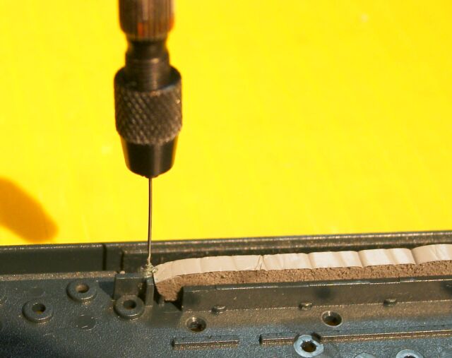 (ドリルは貫通させないように気をつけます。 写真では傷つく可能性のあるキー電極部を取り除いてあります。) |