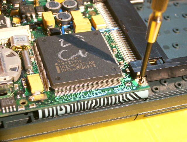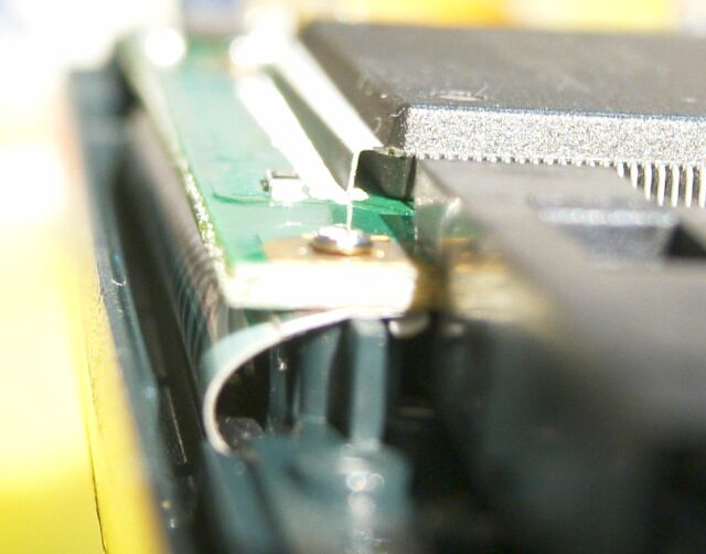 挿入後は、基板の裏面のキーコネクタ部に、キーボードからの電極が密着する様子がわかります。