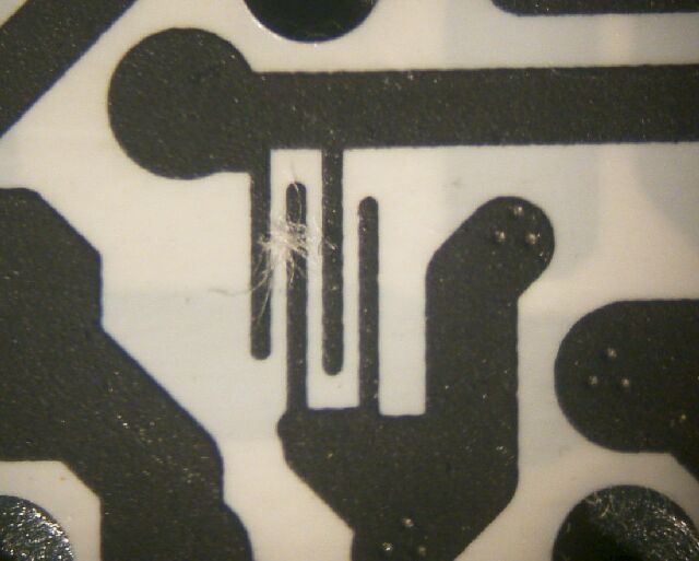 繊維状のゴミですので、絶縁体と言えます。 ゴミは一度入ると押されたときに電極部のカーボン体(炭素塗料)に埋め込まれたようになり、自然には取れません。