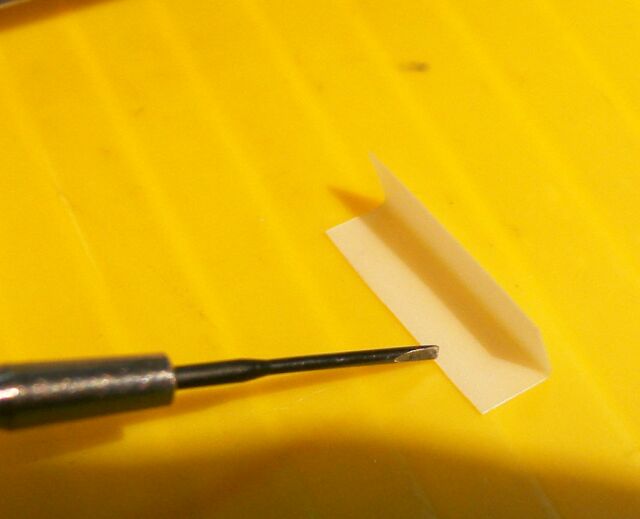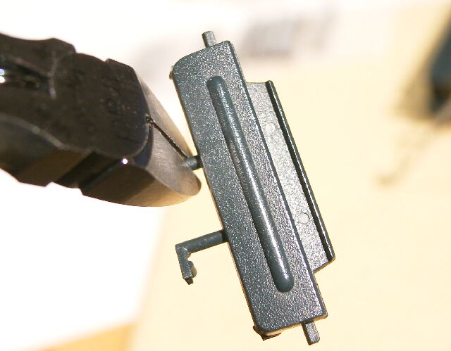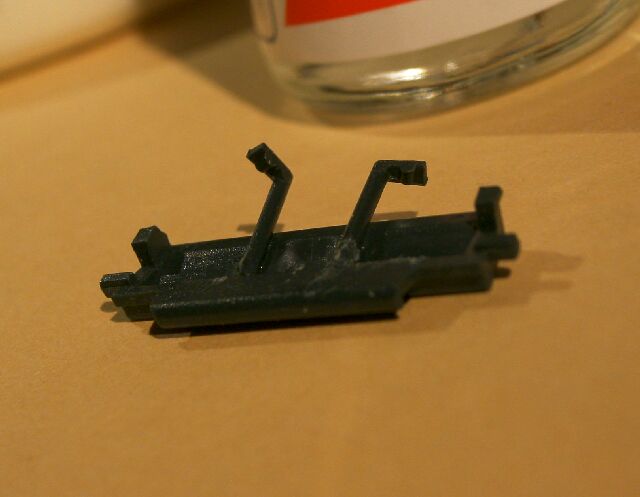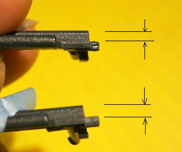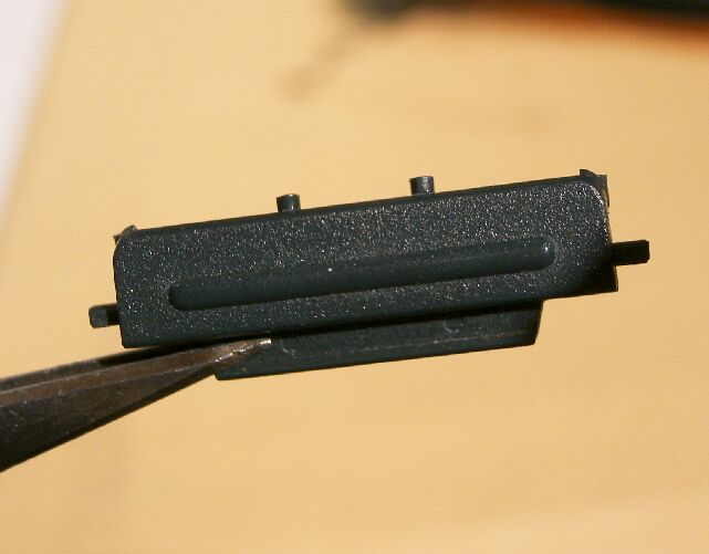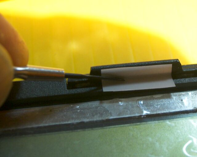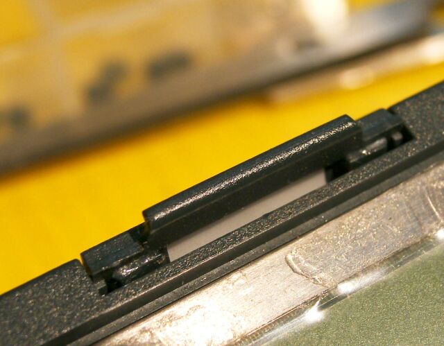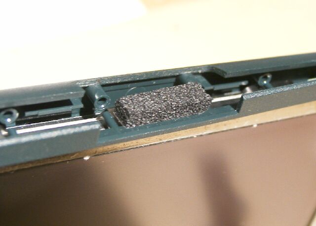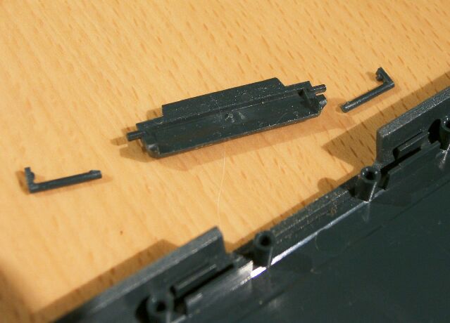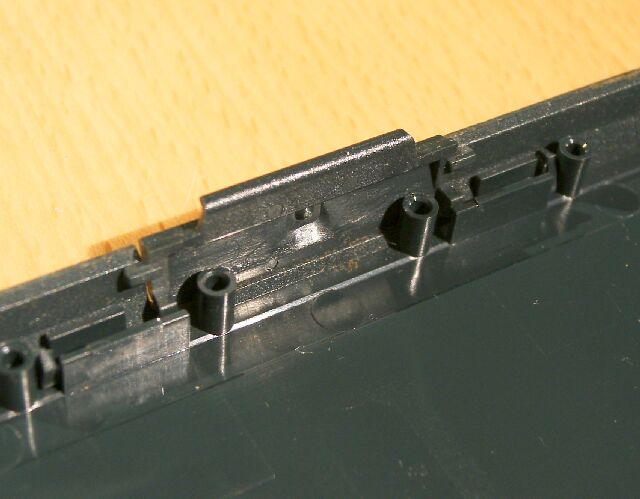 | 液晶のラッチ(噛み合い部)が甘くなると、本体を閉じたときにしっかり噛み合わず、浮いたようになってしまいます。 こうなると、カバンなどから頻繁に出し入れする際に、液晶部が開いてしまって少し扱い難くなります。 このラッチ部のスプリング(戻しバネ)は、ラッチの材質である樹脂の一部を使用した一体成型になっていて、ある回数を超えた使用をすると100%壊れます。(断言) これは、バネの構造が単なる曲げでなく捻り(ねじり)のバネであるため応力の集中があるためのようです。 そこで、いろいろな修理法が提唱され、手前にテレホンカード状のプラスティック片を挟んで、バネの変わりにすることが定番になっています。 しかし、この方法ではラッチの後方が上がってしまい(逃げてしまい)結果として爪が噛み合わず、しっかりとした固定ができません。 以下は、「カチリ」というしっかりとしたラッチが行える修理法です。 |