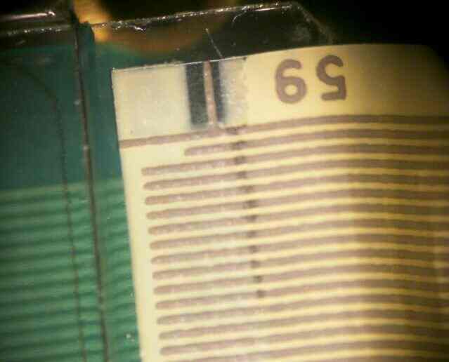上から2本は表示に関係しないので、不具合のあるラインはちょうど10本であることがわかります。(左側に見える緑色の部分に液晶面の導電部を確認することができます) |