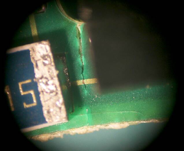 原因は、基板に割れがあり、配線パターンが切れていたためでした。