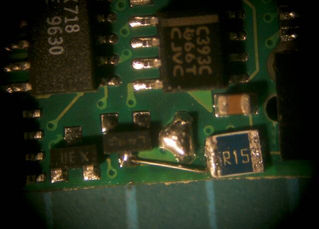 本来左の写真のR15と書かれた部品の両端は、その左の三角状ランドと導通していなければならないところが、200オーム程度の抵抗を持っていました。