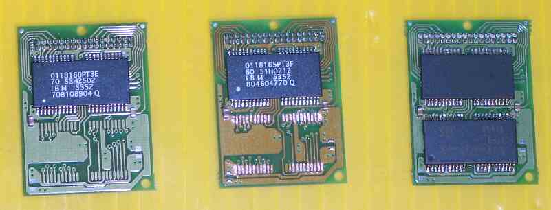 | 4M 200LX機には、メモリ(RAM)拡張基板が挿入されています。 この拡張基板(ドーターボード)には2MB RAMが付いているので、主基板の2MB RAMと合計して4MBを構成しています。 また拡張基板には、空きランド(配線用端子部)があり、ここにもう一つ2MB RAMを取り付けるだけで、4MBのRAMとすることができます。 こうすると本体主基板の2MBと合わせて、合計6MBになります。 とても簡単に拡張できることが特徴です。 この拡張を行なった4MBメモリ基板を、主メモリ1Mの200LXに取り付けると、合計5MBになります。 拡張例: |