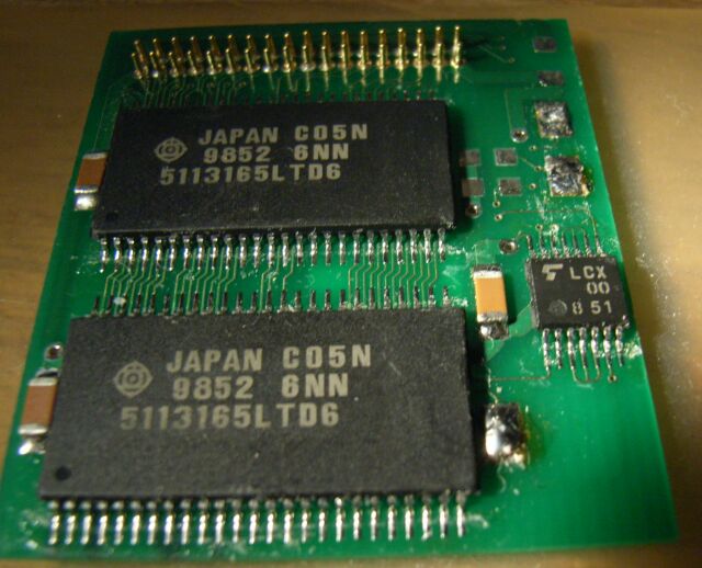 拡張メモリの不具合です。 32MBの増設メモリを搭載した倍速機で、16MBしか認識していないというものです。 このメモリ増設では、本体に付いていた2MBのチップを外し、拡張メモリに16MBチップを2個使用していますので、二つのチップ(memory tip)のうちの一つが認識していないようです。 増設メモリ(Addram LX3 「TNS-HP32」という表示あり。)この増設メモリは、過去にテラネットワークサービスさんで、増設対応されていたようでして、当所に来た修理ご依頼品のうち、メモリ増設機で良く拝見いたします。 (他に、コボルスキーさん、Thaddeus Computing (テディウス)さんの増設メモリも良くあります。) チップには、HM5113165FTD6というメモリが使われています。 (ピン配列) このチップは、低電力消費で使い勝手が良く、今でもyahoo!オークションで増設対応されている方がおられます。 (当所では、保有チップの関係上、最大8MBまでの増設に対応しております。) 増設メモりは、非常に綺麗な配線がされており、通常は不具合を起こしません。 不具合があるとすれば、CPUへの接続線の不具合が主なものです。 今回も接続部分を疑いましたが、切れや半田不良はありません。 そこで、拡張メモリを外して顕微鏡で詳細に検査いたしました。 取り外した拡張メモリその結果、チップへの作動タイミングを規定するゲートICの6番と7番の足が動く状態でした。 つまり、半田が不良になってICの足が浮いているということです。 (不良部は顕微鏡でよく見てもわからないほどです。 ICの足に一本ずつ力を与え、わずかに動くことで初めてわかる程度です。) 拡張メモリ上のゲートICの足が動くこのICには、LCK00の表示ありますので、ゲートIC(2-Input NAND Gate 74LCX00)だと思われます。 このデータを見ますと6番7番は、出力と、負極ですので、6番が接触不良を起こして、メモりの認識が半分になったものと判断いたしました。 最終的に認識しているメモリ動く足と付近の足を再半田し、組み立てたところ、正常に32MBを認識しました。 200LXでは、液晶裏のICや基板上のROMの足の半田不良を多数経験しております。 増設メモリに関しても同様に、足の半田が長期使用による筐体の動き等によって不良を起こすといえます。 当初から強度の振動を考慮した航空宇宙等の機器にも、同様の部品は使われているのですが、半田付け後に、コーティング(皮膜処理)を行うことで、対策としているようです。 200LXにおいてもコーティングを考慮する必要があるかもしれません。(電池の液漏れにも有効ですし。) 2009.12.19 |