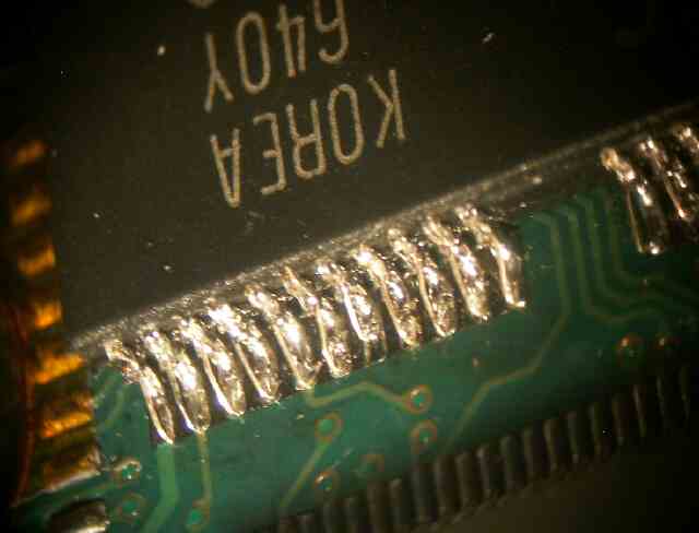 取り外したメモリを200LX主基板上のRAMに乗せ、左から15本目(PIN番号は18番)を除いてすべて半田接続します。