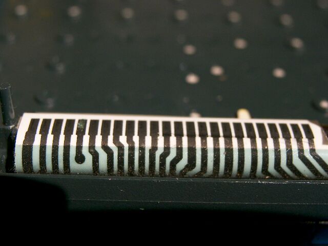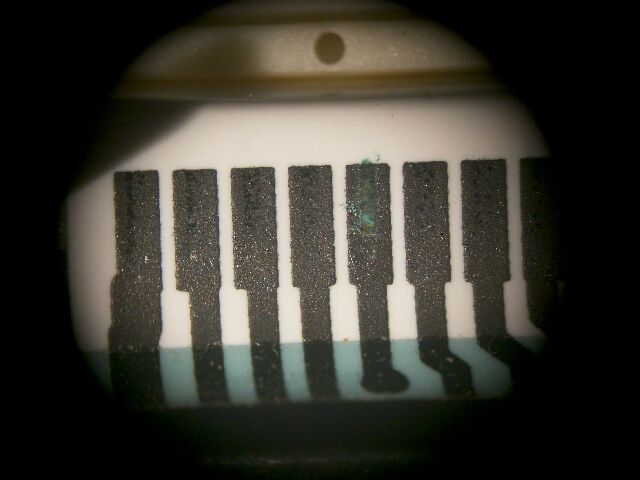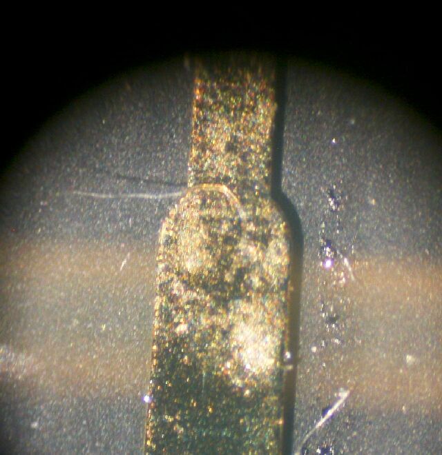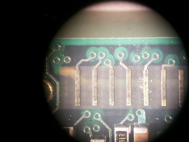 | 何らかの液体状の絶縁剤がコネクタ部に付着したまま、組み立てられその後乾燥して接触不良になったものです。 (その後、同様の例が数例あり、状況から、電池の液漏れにより生じた緑青(ろくしょう)と思われます。 2009.02.24追加) この汚れを削り落とし、キーボード側はさらに導電塗料 で補修して、電源ON/OFFは良好になりました。 |