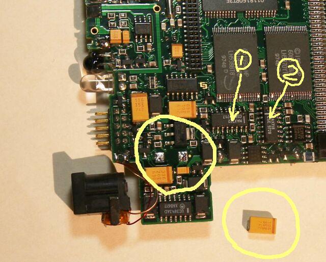 この電圧の源(みなもと)を探ると、基板の裏、写真の位置のコンデンサにたどりつきました。(写真では黄色の丸内から外して右下に置いています)