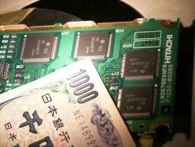 1000円札の角が、IC(LSI)の足の下に入り込んでいるところがわかります。