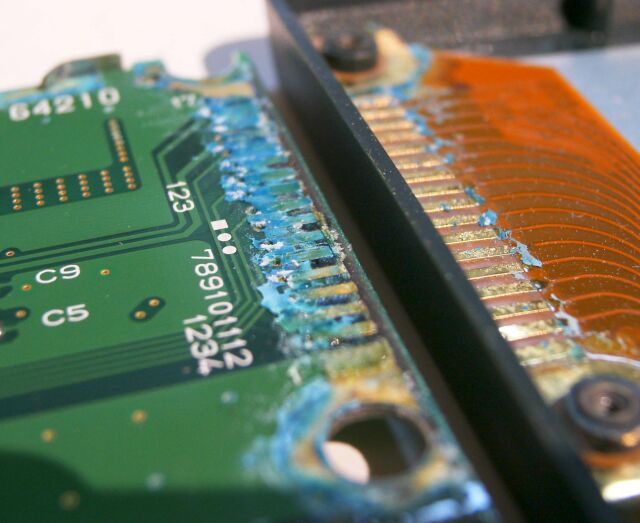 フレキは層が別れて分解してしまい、銅の部分が緑青を生じています。