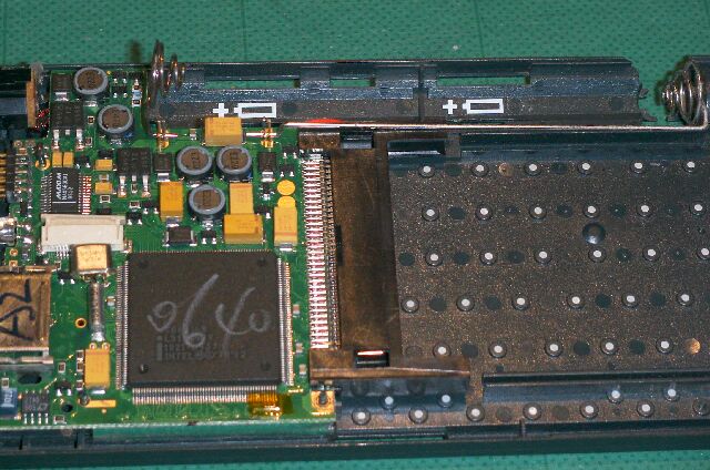 このV字型のバネが緩むと、電池電極への接触不良を起こします。これにより電池を頻繁に抜いたり入れたりするような状況となり、バックアップ電池あるにもかかわらず本体がリセットされる状態になっていました。 |