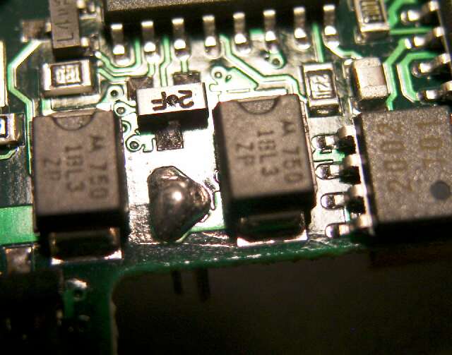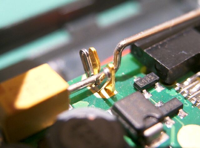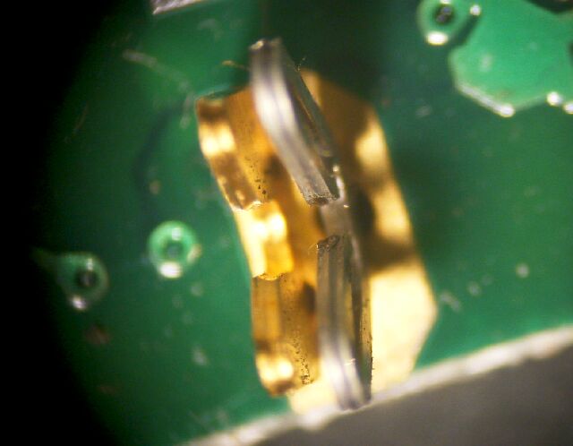 半田の補修により、V字型バネ電極を固定し、さらにバネ圧の調整と、金メッキされた受け電極の間隔調整を実施して、修理とします。 |