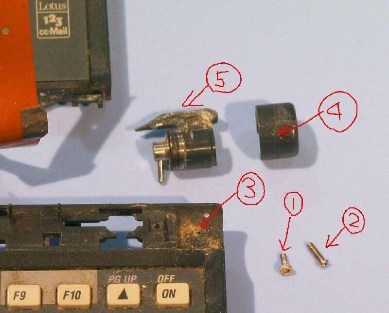 長いネジ(2)は、上蓋に付いたナットからはみ出し、本体にまで達し、穴(3)を開けて、さらに飛び出し、ヒンジキャップ(4)に達していました。