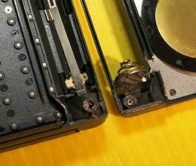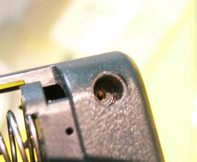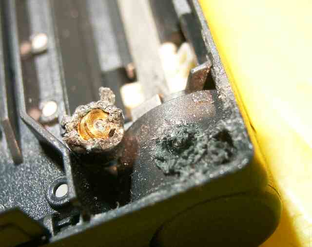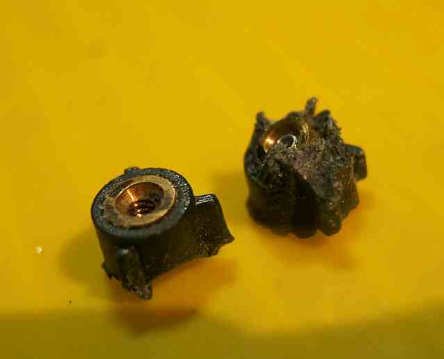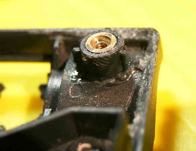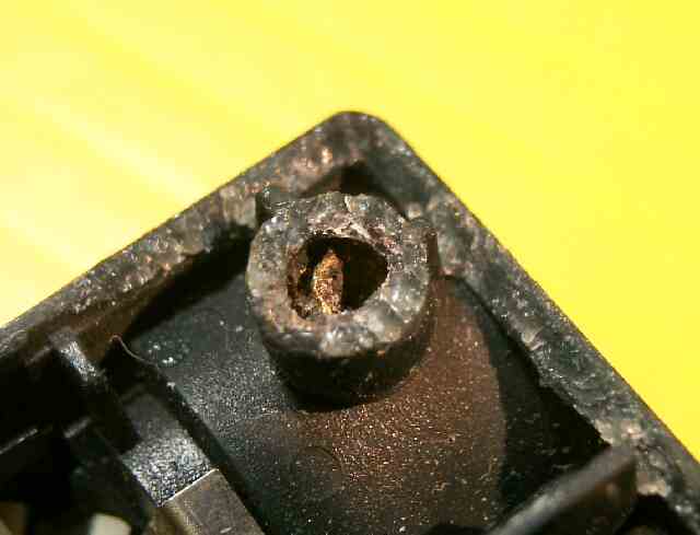 | この事例は、本体筐体(きょうたい)を固定するネジが切れており、補修できなかったのでしょう、瞬間接着剤で処理してあったものです。 ネジが切れていただけであれば、なんとか取り出す手だてもあったのですが、すでにナット(雌ネジ)自体が破損していました。 こうなると交換で対処します。 (適当な雌ネジがあれば、これを入れることでも補修可能かと思います。) |