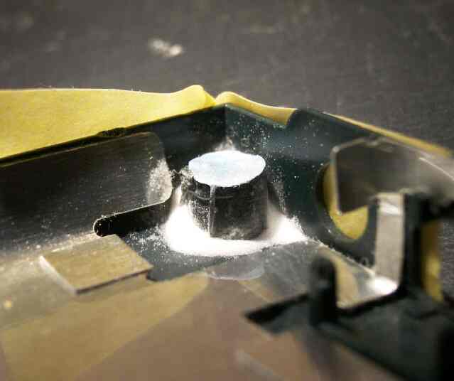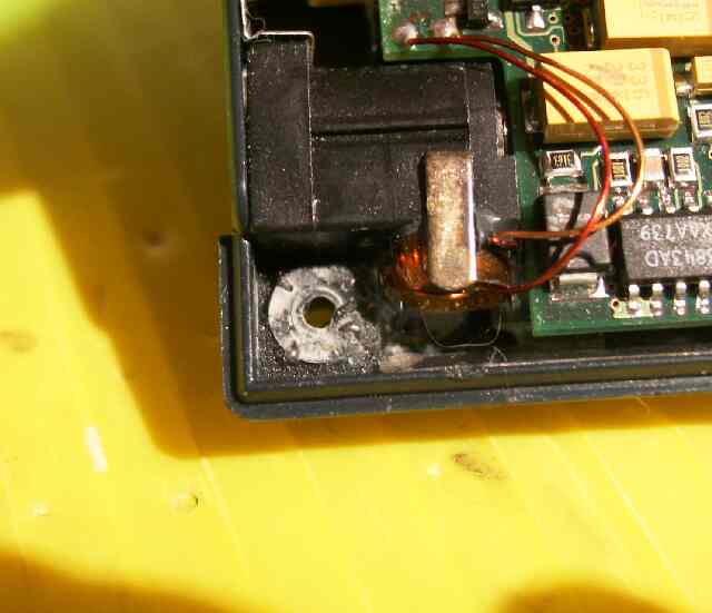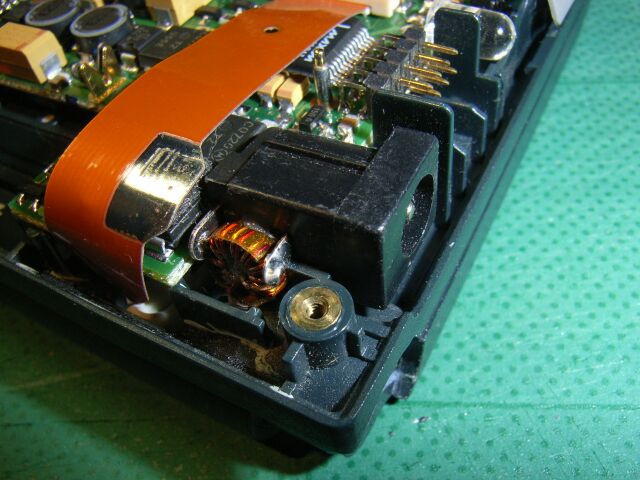 | ちょっとした衝撃で、200LXの底蓋が部分的に開いてしまうことがあります。 これは、底蓋を留める4本のネジ部の一部が内部で割れてしまうためです。 この補修例は、特に割れが生じやすい右側ヒンジ下部分の修理例です。 この部分は、基板が密着する部分であるので、補修剤を大きく肉盛りした補修ができず、 強度を確保する補修が難しい部分です。 |